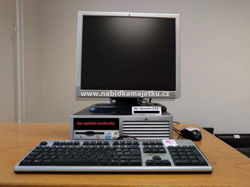 PC HP Compaq DS5100S, procesor Intel Pentium 4 3 GHz, RAM 2 GB, HDD 80 GB, FDD, monitor HP L1740, klávesnice, myš, propojovací a napájecí kabely. Bez optické mechaniky. Operační systém není nainstalován, HDD je smazán. Bez instalačních medií.